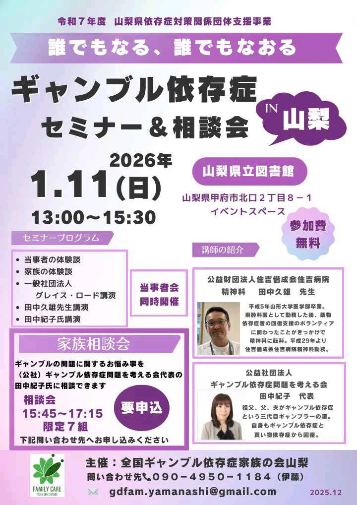 NPO法人全国ギャンブル依存症家族の会 > Blog > イベント情報 > 【山梨】ギャンブル依存症セミナー&相談会