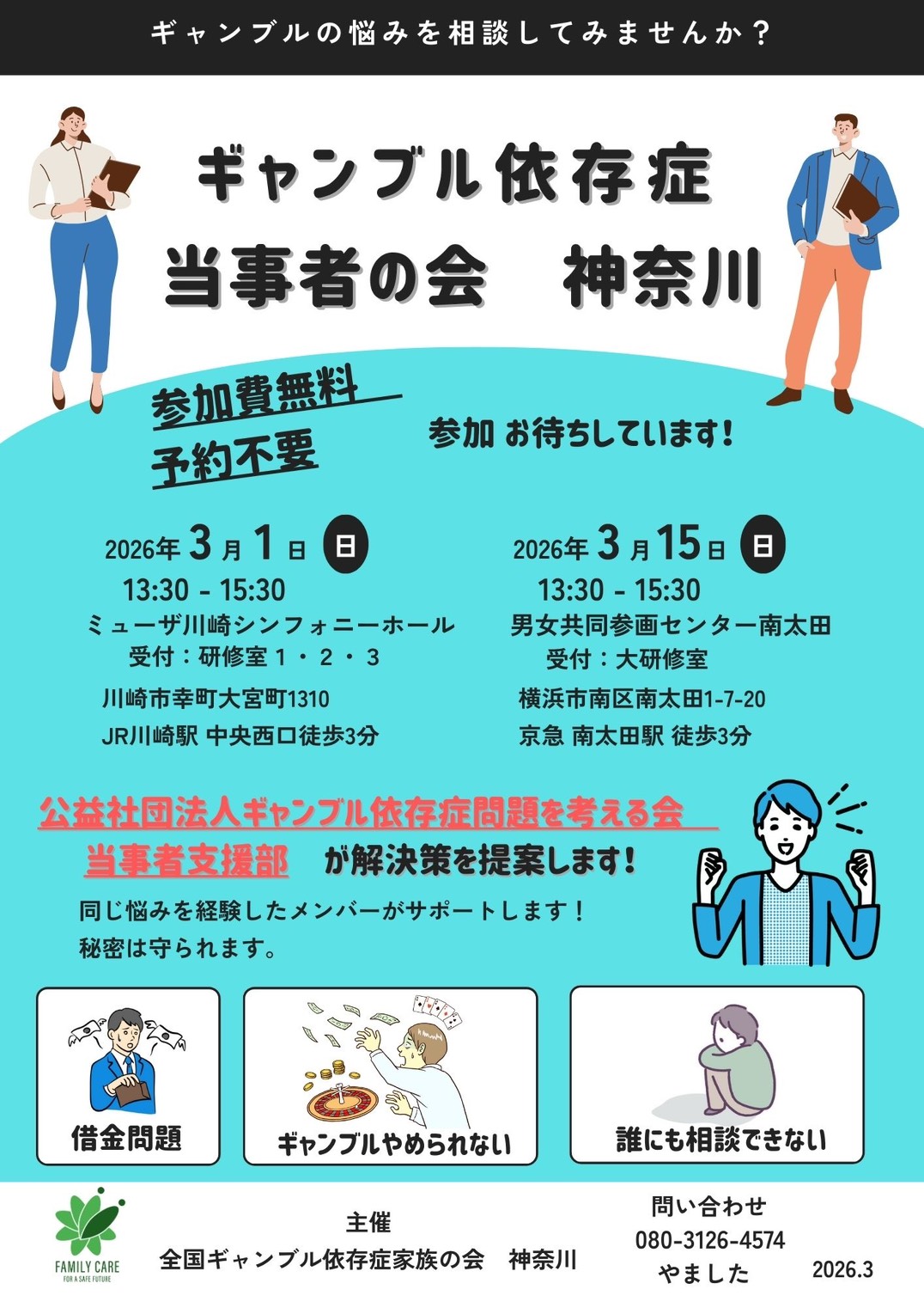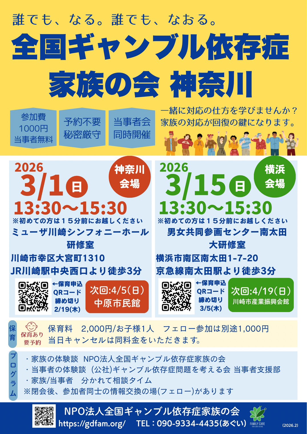 チラシのPDFダウンロード開催場所【神奈川】フォーラム南太田(男女共同参画センター横浜南) 【当事者会同時開催】住所 神奈川県 横浜市南区 南太田1丁目7−20お問い合わせ090-9334-4435 (担当 あぐい)その他チラシのPDFダウンロード 家族の会【神奈川・横浜】