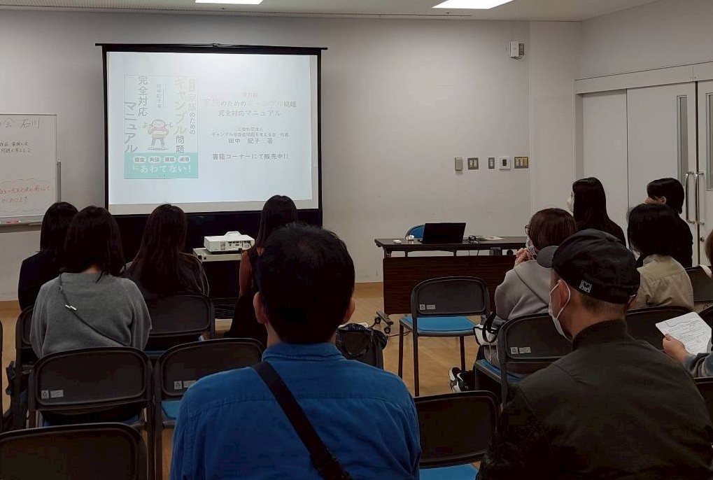 はじめに、家族の会東京のメンバーから体験談を聞きました。夫のギャンブルを自身で何とかしなければと、一人で抱え込み誰にも相談できずにいたそうです。しかし、家族会に参加したことで正しい対応を学び、今では元気に啓発活動をしている姿に大きな勇気を貰いました。