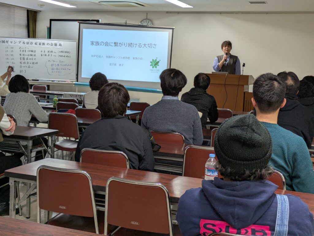 令和7年12月20日(土)徳島県立総合福祉センターにて全国ギャンブル依存症家族の会徳島が開催されました。 はじめに、公益社団法人ギャンブル依存症問題を考える会当事者支援部メンバーの体験談を聞きました。ゲーム依存に苦しんでいたが、家族が当会に参加し依存性という病気を理解し、正しい対応を学び、依存症は病気だから一緒に治していこうと言ってくれたことで、ご自身も回復への道へ繋がることができた。今は当事者を支援する立場で活動していると生き生きと話す姿に希望をもらえました。